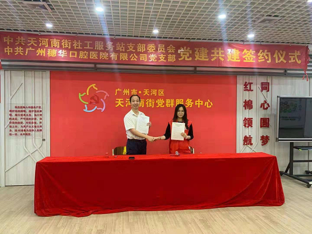 (黃景輝報道:)4月2日,廣州市天河區天河南社工站黨支部與穗華口腔醫院黨支部聯合開展黨建共建簽約儀式。雙方就下一步開展“傳承紅色基因,踐行初心使命”進行了交流和座談。天河區天河南街社工站黨支部書記梁寅遞、天河南街社工服務站主任陳桂城與穗華口腔醫院黨支部書記、穗華關愛好人工作站負責人肖金,穗華口腔醫院天河院區社會服務部主管、五星志愿者梁學銘等參加了簽字儀式并進行了座談!