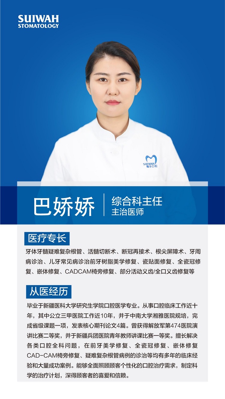 巴嬌嬌醫生畢業于新疆醫科大學研究生學院口腔醫學專業,自投身口腔醫學事業以來,她始終秉持著對專業的熱愛和對患者的責任感,不斷學習與鉆研。她深知口腔健康對生活質量的重要性,從簡單的齲齒治療到復雜的顯微根管治療術,每一項她都全力以赴,力求為每一位患者提供優質的口腔醫療服務。