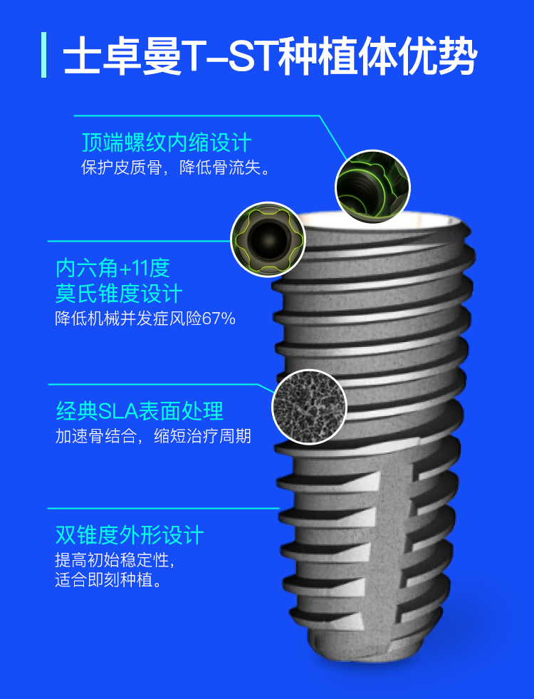 瑞士士卓曼T-ST種植提系統(tǒng)沿襲了品牌70年的技術(shù)積淀,不僅采用瑞士精工工藝、4級純鈦材料,而且嚴格采用瑞士質(zhì)量控制標準,通過士卓曼QST認證,種牙穩(wěn)定舒適,安全耐用。此外,在國家集采政策支持下,T-ST種植系統(tǒng)更是實現(xiàn)“國際品質(zhì),國民價格”的突破,例如全口無牙頜患者一次手術(shù)即可完成重建,術(shù)后當天可進食軟食,顯著降低治療成本,真正做到質(zhì)優(yōu)價宜,惠及廣大患者!